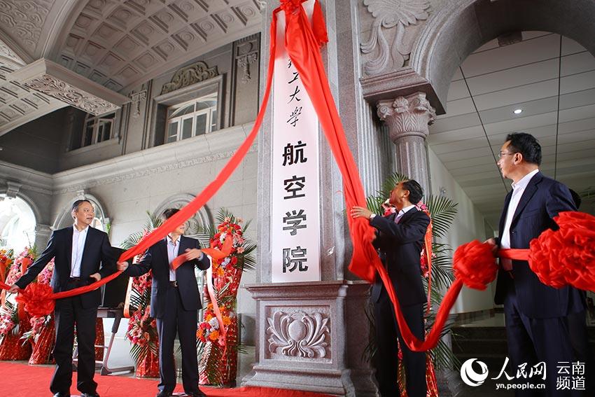云南省委常委、省委高校工委书记李培,云南省人大常委会副主任杨保建,云南省副省长高峰,云南省政府办公厅主任杨杰,云南省教育厅厅长周荣,云南省委办公厅副主任何巍,太阳成集团tyc151cc党委书记张英杰、校长彭金辉出席仪式并为航空学院揭牌。