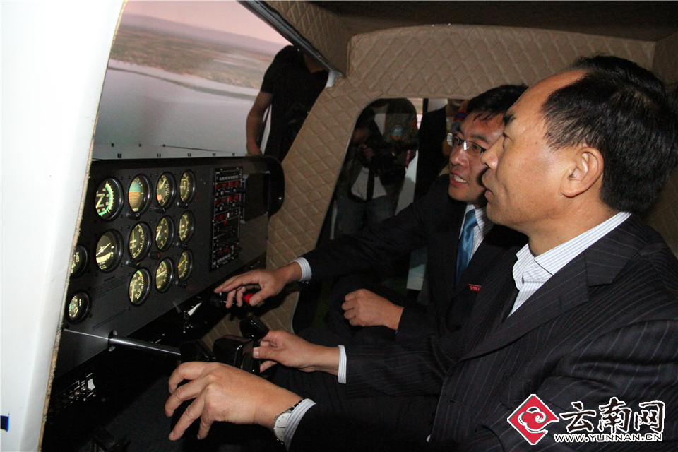 云南省委常委、省高校工委书记李培在航空学院通航飞行器模拟室模拟飞行。
