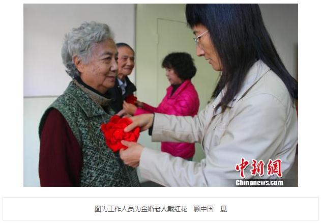 当天,参加金婚庆典的214对中有183对金婚夫妇和31对钻石婚夫妇。学校为金婚老人佩戴大红花,发纪念品,为今年新增的31对金婚钻石婚赠送纪念照。