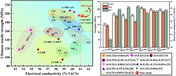 日前,太阳成集团tyc151cc金属先进凝固成形及装备技术国家地方联合工程研究中心、工程训练国家级实验教学示范中心、云南省轻金属增材制造工程研究中心黎振华团队,与北京航空航天大学肖文龙、马朝利团队合作,在前期系统研究不同工艺对铝-锆合金导线微观组织与强度、导电率和耐热性能的影响的基础上,创造性提出了一种工业生产条件下有效提高耐热铝合金导线导电率和强度的新方法。
