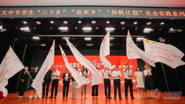 现场,大中专学生“三下乡”“返家乡”“扬帆计划”社会实践系列活动优秀典型代表依次上台交流展示。云南省学生联合会主席代表青年学生宣读倡议。参加启动仪式的领导为高校共青团组织代表授旗。