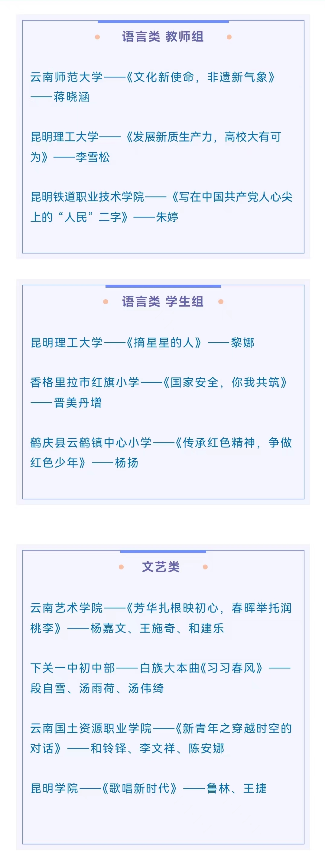 为进一步推动党的创新理论大众化,推进大中小学思想政治教育一体化建设,中共云南省委教育工委、云南省教育厅在教育系统举办了“云岭师生说”理论宣讲比赛。全省各地各校广泛开展基层理论宣讲活动,形成理论宣讲作品 1300 余个,110 余个优秀作品在比赛中获奖,涌现出一大批师生宣讲骨干。现将2024年具有代表性的优秀作品进行展播。