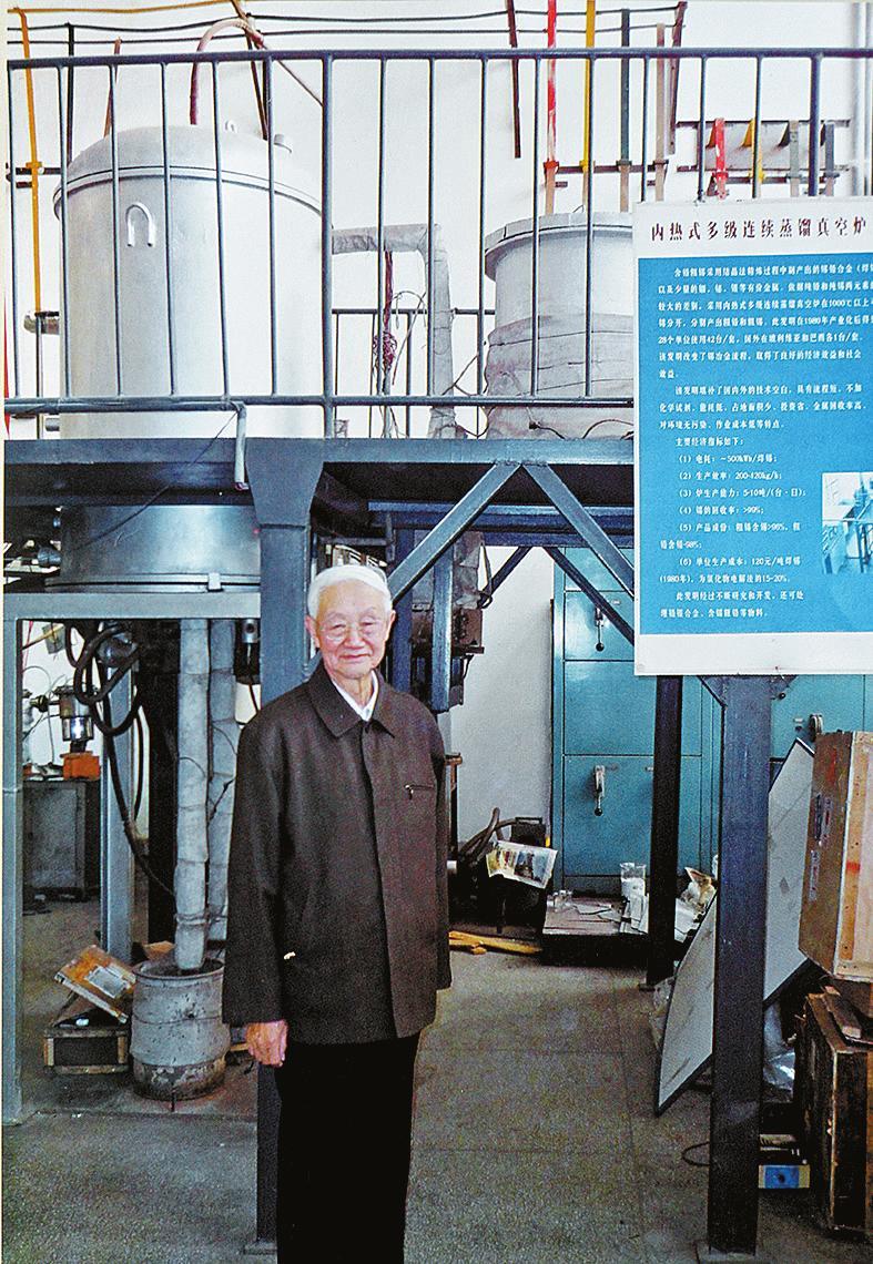 戴永年院士站在他主持研制的内热式多级连续蒸馏真空炉前。(资料图)