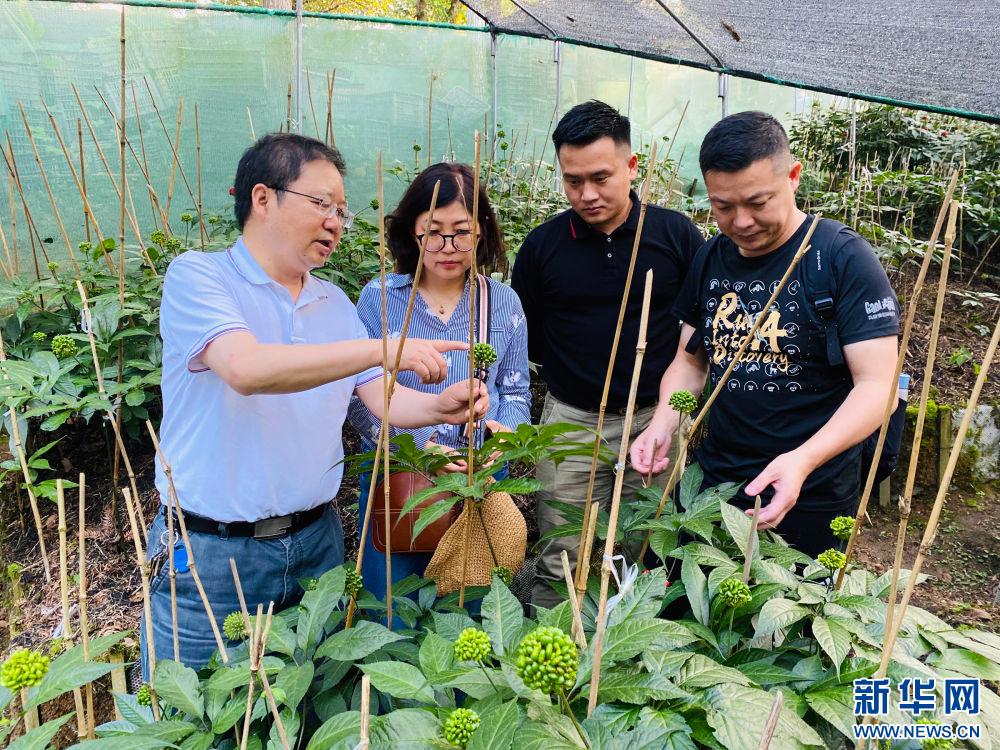 崔秀明(左一)在三七种植基地(资料图)。