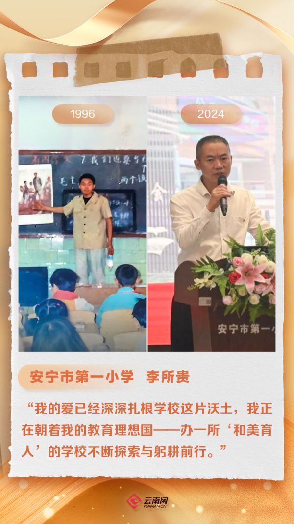 时光荏苒,容颜虽随岁月更迭,而教育之心,始终璀璨如初。昔日初踏杏坛,他们以青涩之姿,怀揣满腔热忱;今朝追光逐梦,历经风雨洗礼,他们又以何种风采屹立?值此第40个教师节之际,云南网匠心策划《教师节时光印记特辑》,征集了40位云岭教师的从教岁月对比照,跨越时光的长廊,共鉴他们与教育不解之缘的“蜕变与坚守”。让我们携手步入这段光影交织的旅程,细品岁月悠悠中那份愈发醇厚的教育情怀。今天推出第二期。