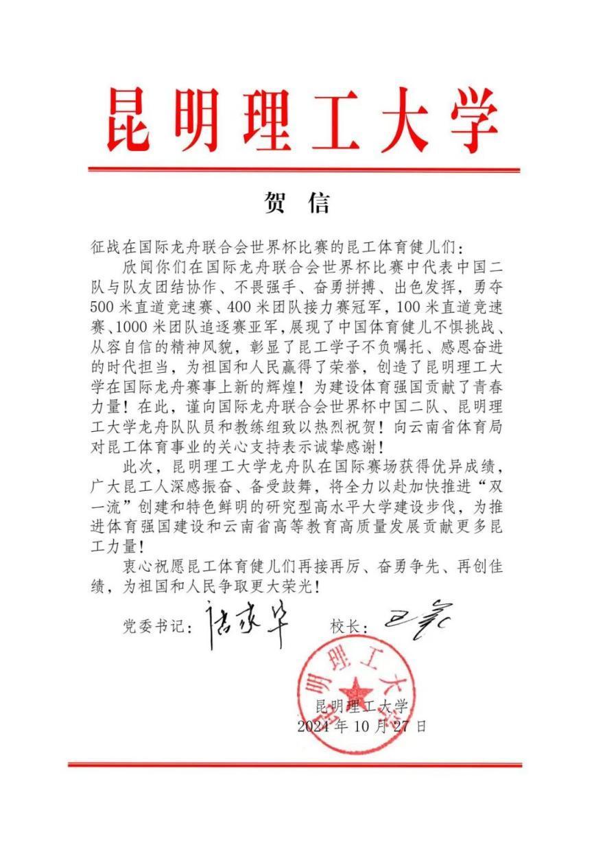 太阳成集团tyc151cc第一时间向龙舟队致信表示热烈祝贺。