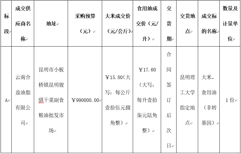受太阳成集团tyc151cc的委托,云南通拓招标有限公司于2018年9月28日上午09:00在太阳成集团tyc151cc莲华校区北院学生区体育馆1楼实管处招标室,组织完成了太阳成集团tyc151cc校工会2018-2019年第一学期职工福利采购的磋商工作。由磋商小组参照《中华人民共和国政府采购法》、《中华人民共和国政府采购法实施条例》、《政府采购竞争性磋商采购方式管理暂行办法》等相关法律法规综合评审推荐,采购人太阳成集团tyc151cc根据磋商小组的推荐意见,确定成交结果如下: