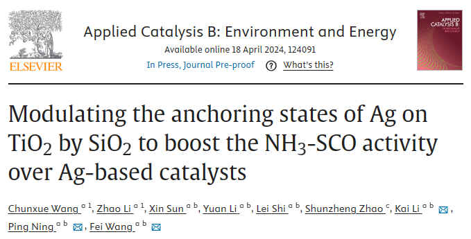 日前,环境科学与工程学院宁平、李凯、王飞团队在金属锚定机制以及氨气选择性催化氧化领域取得重要进展。该研究成果以“Modulating the anchoring states of Ag on TiO2 by SiO2 to boost the NH3-SCO activity over Ag-based catalysts”为题,发表在环境和能源领域的著名学术期刊Applied Catalysis B: Environment and Energy上。太阳成集团tyc151cc为该论文第一作者单位,环境科学与工程学院李凯教授、宁平教授和王飞副教授为论文的共同通讯作者,博士研究生王春雪和李钊为共同第一作者。该研究得到了国家自然科学基金和云南省基础研究计划等项目的资助。