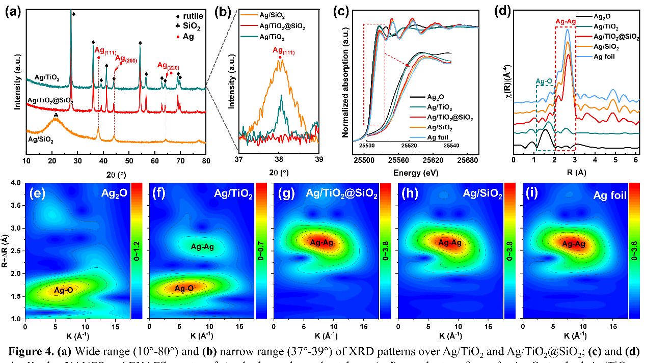 基于此,研究团队通过经典的Stöber方法合成了具有核壳结构的TiO2@SiO2复合材料,以此作为载体运用浸渍法制备了负载型Ag基催化剂,相较于Ag/TiO2和Ag/SiO2催化剂,Ag/TiO2@SiO2在NH3-SCO反应中的本征和表观活性差异明显提升。通过HAADF-STEM、XRD和XAFS等表征手段确定了Ag/TiO2@SiO2催化剂上Ag的分散度和价态与Ag/TiO2和Ag/SiO2存在明显差异。