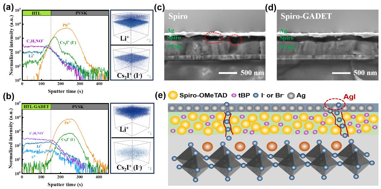 Fig. 2 Stabilizing HTL and Ag electrode via suppressing Li+ and halide ions migration and diffusion by GADET modification. TOF-SIMS depth distribution of perovskite/HTL films without (a) and with (b) GADET which were aged under light and heat at 60 ℃ for 240 h in a nitrogen filled glovebox. Cross-sectional SEM images of the HTLs without (c) and with (d) GADET after aging under light and heat at 60 ℃ for 240 h in a nitrogen filled glovebox, (e) Schematic diagram of halogen ion migration and AgI formation in the devices based on pristine HTL.