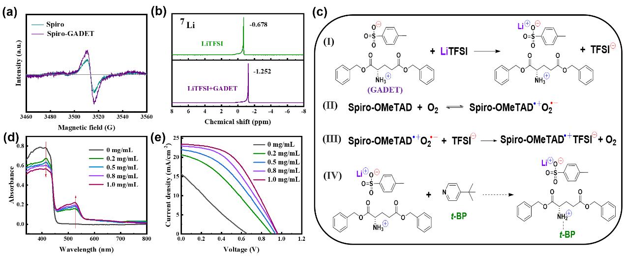 Fig. 1 Promoting doping and its mechanism investigation via introducing GADET. (a) ESR spectra of the Spiro-OMeTAD films without and with GADET doping. (b) 7Li NMR of the LiTFSI solution without and with GADET. (c) Doping efficiency enhancement and HTL stabilization mechanisms upon incorporating GADET. (d) UV-vis spectra of the Spiro-OMeTAD solutions with gradual addition of GADET (without LiTFSI and tBP). The solutions were prepared in the nitrogen glove box. The measurement was conducted in ambient condition. (e) J-V curves of the champion devices based on the Spiro-OMeTAD solutions containing different concentrations of GADET (without LiTFSI and tBP).