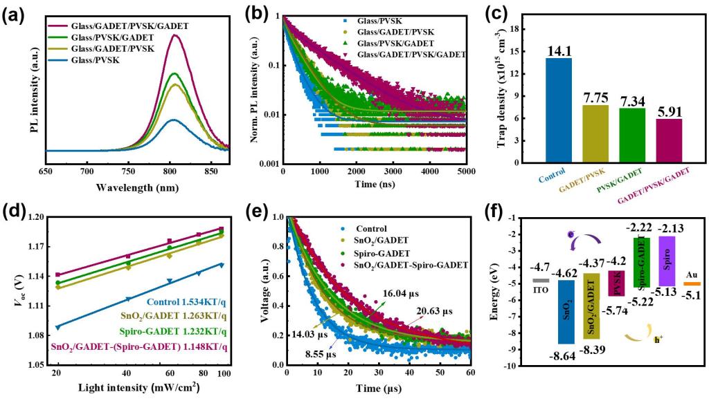 Fig. 4 Carrier dynamics study. (a) SSPL and (b) TRPL spectra of the perovskite films deposited on non-conductive glass without and with bottom surface passivation, top surface passivation or synergistic passivation via GADET. (c) Defect density for the perovskite films without and with bottom surface passivation, top surface passivation or dual surface passivation by GADET. (d) VOC versus light intensity for the devices with or without modification. (e) TPV curves for the control and modified PSCs. (f) Energy band diagram of all device components.
