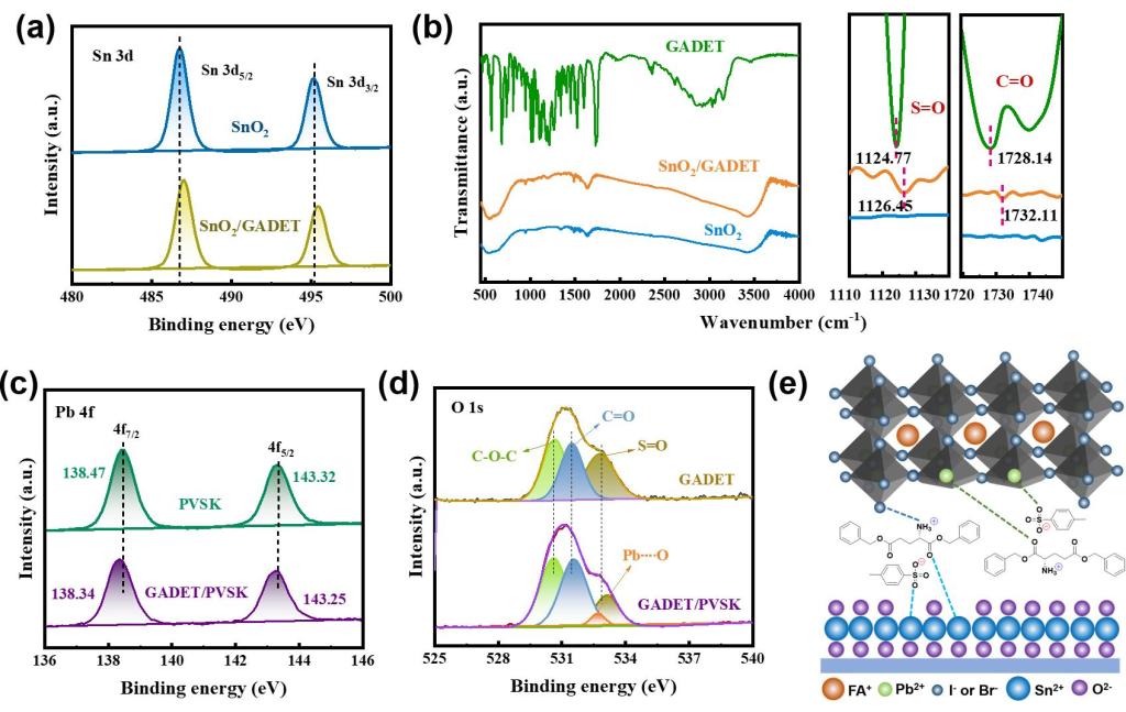 Fig. 3 Modulation mechanisms of buried interface via GADET. (a) XPS spectra of Sn 3d from the SnO2 films with and without GADET treatment. (b) FTIR spectra of the pristine and treated SnO2 films with GADET. XPS spectra of (c) Pb 4f and (d) O 1s from the perovskite films with and without GADET. (e) Schematically illustrated diagram of the buried interface defect passivation by GADET.
