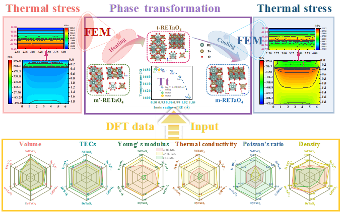 (1)建立和应用跨尺度热应力模型,对低应力的稀土钽酸盐热障涂层体系进行逆向设计,成功找到低热应力相关特征。相关研究成果以“Unveiling thermal stresses in RETaO4 (RE = Nd, Sm, Eu, Gd, Tb, Dy, Ho and Er) by first-principles calculations and finite element simulations”为题,发表在国际顶级学术期刊Acta Materialia上。