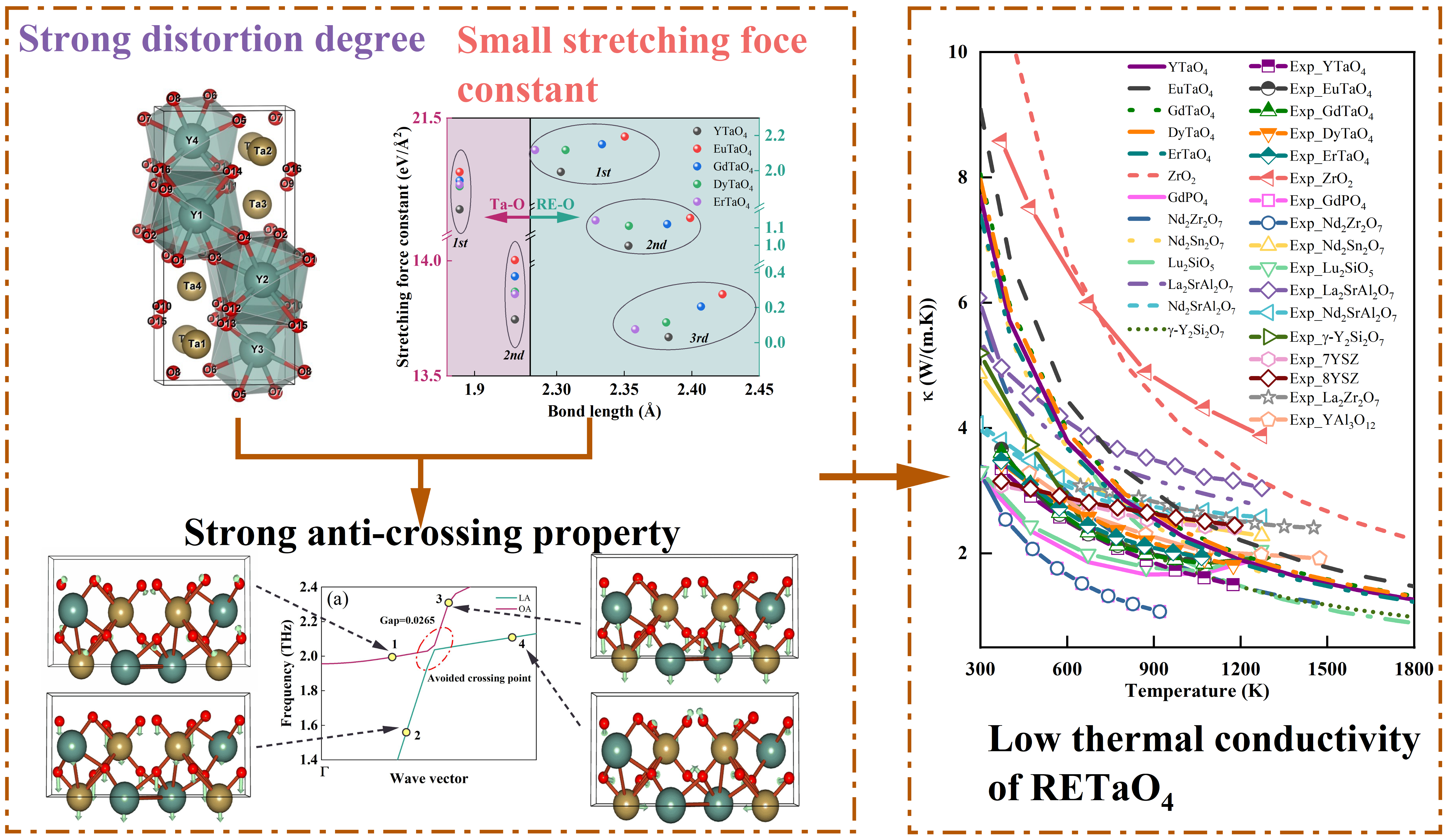 (3)优异的隔热性能是热障涂层低热应力和稳定、长时服役的关键,但稀土钽酸盐低热导率的起源之前尚不清晰。通过第一性原理结合玻尔兹曼输运方程求解,揭示了稀土钽酸盐低热导率的机制:低的声学支截止频率和强的声光学支抗交叉导致稀土钽酸盐的强非谐效应和大的散射率。最后筛选出两个低热导率的特征:大的多面体畸变程度和小的拉伸力常数。相关研究成果以“Understanding the ultralow lattice thermal conductivity of monoclinic RETaO4 from acoustic-optical phonon anti-crossing property and a comparison with ZrO2”为题,发表在国际顶级学术期刊Journal of the American Ceramic Society上,并入选ESI高被引论文。