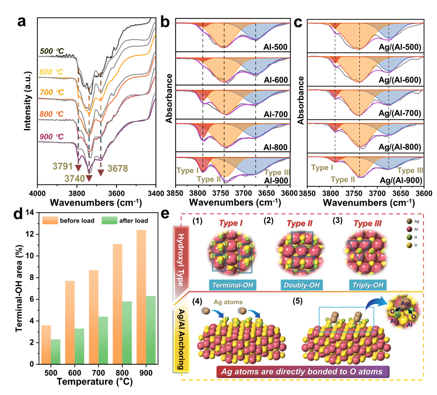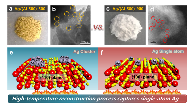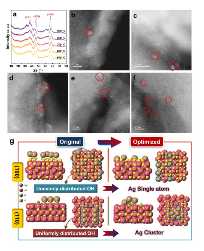 “端羟基锚定机制”在金属氧化物(Al2O3, CeO2)以及多种贵金属和过渡金属(Ag, Pt, Pd, Cu, Ni, Fe, Mn, Co)上已经有了大量的研究,但如何调节端羟基的含量来影响活性物种的分散,从而达到最佳的催化性能,仍然存在一定空白。本文利用AlOOH作为γ-Al2O3的前驱体,通过控制煅烧温度,诱导γ-Al2O3的暴露晶面从(110)晶面转变为(100)晶面,从而产生更多的端羟基来锚定Ag物种。结合AIMD和DFT的实验结果表明,温度可以驱动(110)晶面上原子发生重排,从而形成与(100)晶面类似的原子排列结构。这导致载体在高温煅烧过程中形成了更多的端羟基,成功地捕获Ag物种以单原子形式分散在γ-Al2O3上,最终开发出稳定高效的单原子Ag基催化剂。
