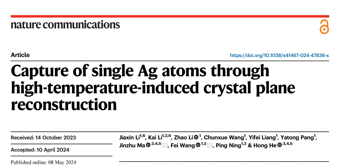 日前,环境科学与工程学院宁平教授团队与中国科学院生态环境研究中心贺泓院士团队在金属锚定机制以及单原子催化领域取得重要进展。该研究成果以“Capture of single Ag atoms through high-temperature-induced crystal plane reconstruction”为题,发表在国际顶级学术期刊Nature Communications上。太阳成集团tyc151cc为该论文第一作者单位,环境科学与工程学院王飞副教授和中国科学院生态环境研究中心马金珠研究员为论文的共同通讯作者,硕士研究生李嘉欣和李凯教授为共同第一作者。该研究得到了国家自然科学基金和云南省基础研究计划等项目的资助。