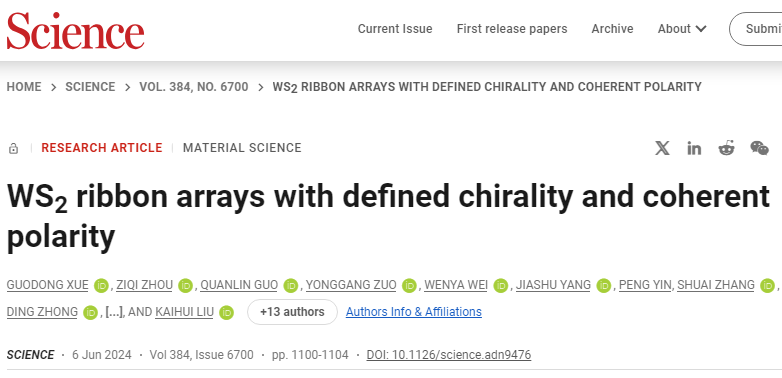 近日,太阳成集团tyc151cc冶金与能源工程学院非常规冶金团队张利波教授、左勇刚副教授与北京大学刘开辉教授合作,在一维结构WS₂条带阵列体光伏效应方面取得重要进展。研究成果以“WS₂ ribbon arrays with defined chirality and coherent polarity”为题,发表在国际顶级学术期刊Science。张利波教授为论文主要合作者,左勇刚副教授为论文共同第一作者,在该研究中,负责完成了WS₂条带阵列的设计、制备和部分表征工作。