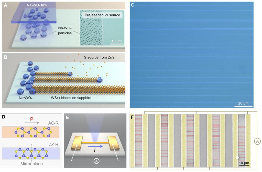 图1:具有可控手性与相干极性WS₂条带阵列制造及自发光电流集成输出