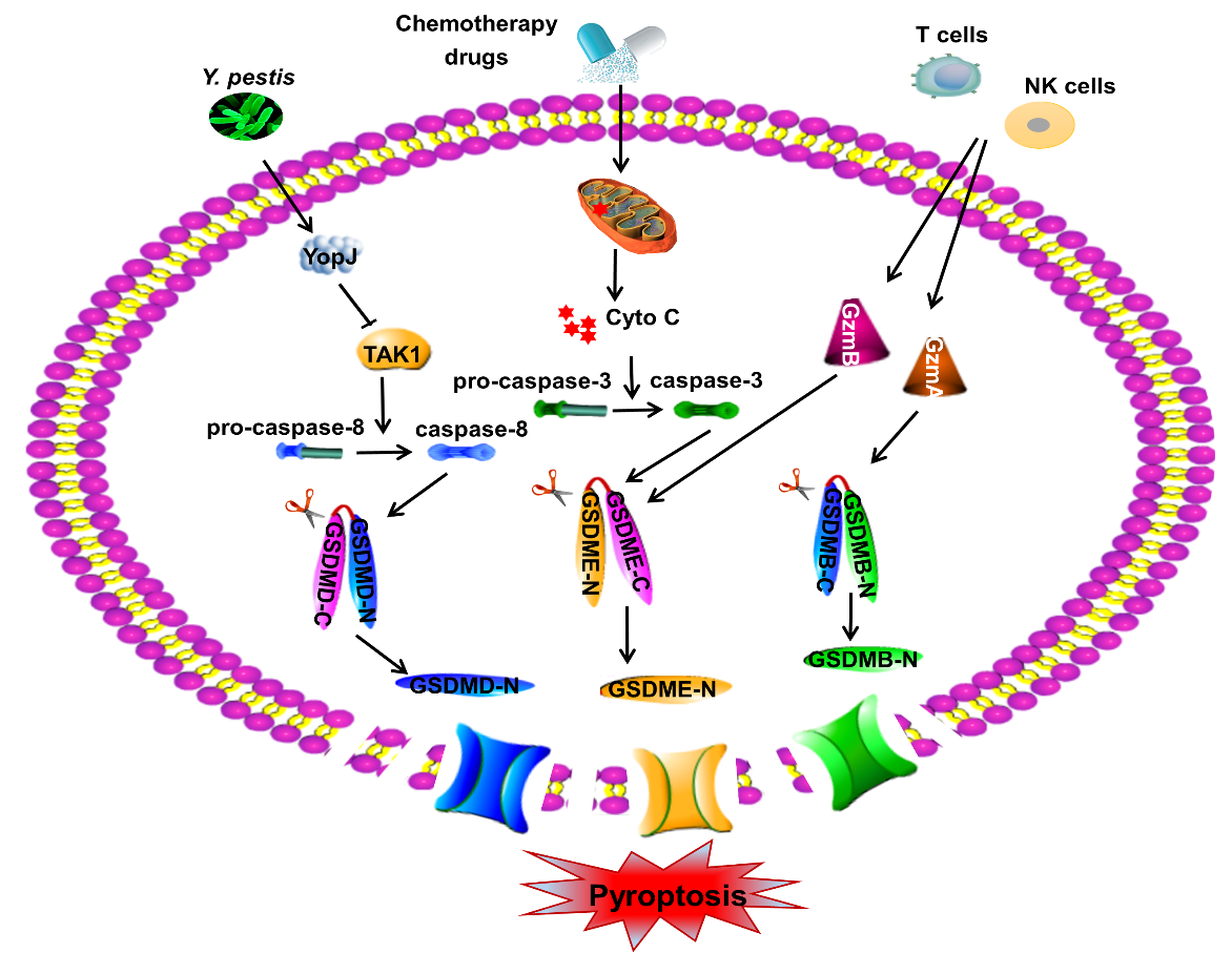 细胞焦亡(Pyroptosis)是近年来发现的一种新的细胞程序性死亡方式,又称细胞炎性坏死。自2015年北京生命科学研究所邵峰院士等人发现了细胞焦亡的执行蛋白Gasdermin-D(GSDMD)以来,细胞焦亡迅速成为研究热点,其广泛参与感染性疾病、神经系统疾病和恶性肿瘤等多种疾病的发生发展。