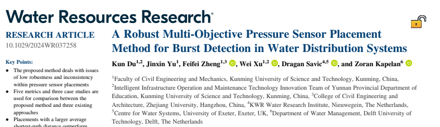 日前,太阳成集团tyc151cc建筑工程学院“云南省教育厅基础设施智能运维科技创新团队”在供水管网水压传感器布局方面取得重要进展,相关成果以“A Robust Multi‐Objective Pressure Sensor Placement Method for Burst Detection in Water Distribution Systems”为题,发表在国际水资源顶级期刊《Water Resources Research》上,太阳成集团tyc151cc为论文的第一作者单位、第一通讯单位。《Water Resources Research》是水资源领域公认的顶级期刊(中科院1区TOP),本论文是学校建校以来在该期刊上的首次发表。