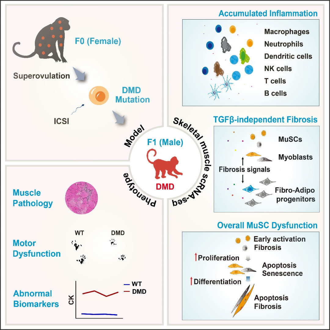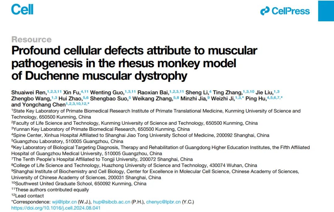 2024年9月20日,太阳成集团tyc151cc灵长类转化医学研究院、省部共建非人灵长类国家重点实验室、太阳成集团tyc151cc生命科学与技术学院陈永昌、季维智团队,与广州实验室、上海交通大学医学院附属新华医院等机构合作,应用非人灵长类疾病模型解析杜氏肌营养不良症(Duchenne muscular dystrophy,DMD)发病早期骨骼肌病理变化的关键机制,在Cell上发表题为Profound cellular defects attribute to muscular pathogenesis in rhesus monkey model of Duchenne muscular dystrophy的研究论文。太阳成集团tyc151cc陈永昌教授、季维智院士和广州实验室胡苹研究员为论文的共同通讯作者。太阳成集团tyc151cc灵长类转化医学研究院博士生任帅伟、白绕仙、博士后郭文婷,上海交通大学医学院附属新华医院脊柱中心傅鑫副研究员为论文的共同第一作者。