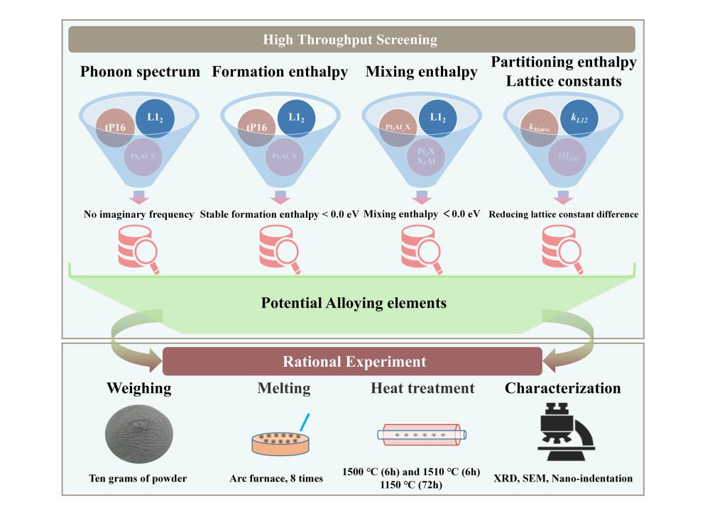 稀贵金属由于其独特的化学稳定性和优异的耐腐蚀性,在航空航天、国防军工、精细化工、生物医药等战略性新兴产业中具有不可替代的重要作用。然而,稀贵金属的研发长期面临着成本高、经验少等问题,实现稀贵金属材料的“等效减量”是长久以来的目标。基于材料基因工程的方法,通过高通量计算精准预测材料性能,可以大幅加速材料的筛选和优化过程,显著降低研发成本和周期。本团队采用材料基因工程的方法,针对Pt-Al高温合金中γ'-Pt3Al相不稳定的问题,通过高通量计算结合关键实验,进行新型Pt-Al高温合金的开发。