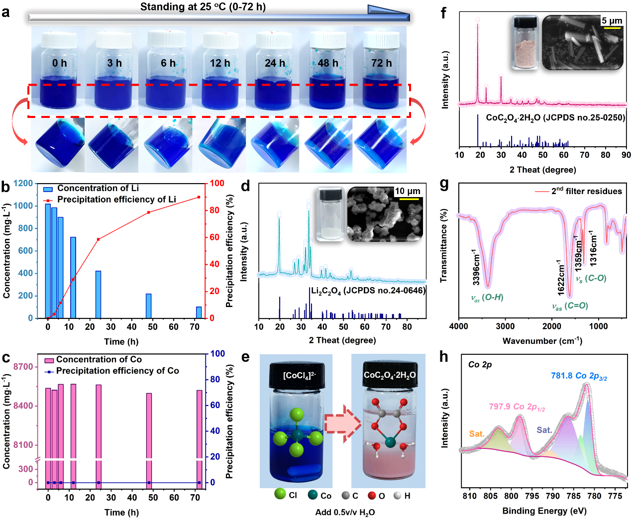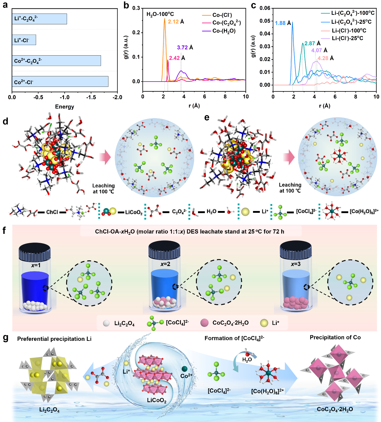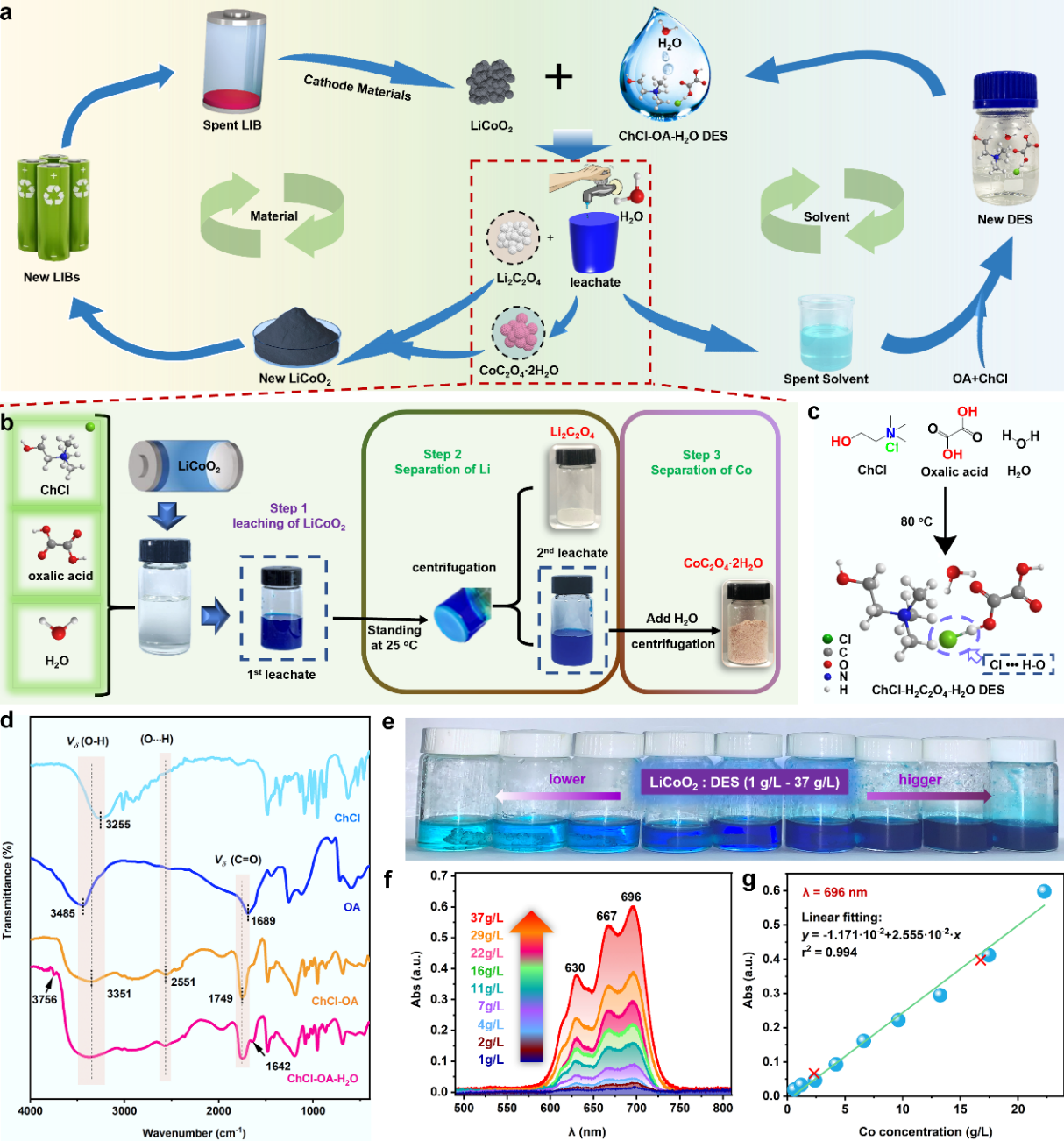 由于锂盐在水溶液中的溶解度较高,使得Li难以直接沉淀,因此,如何实现Li的短程优先提取成为目前面临的巨大挑战。针对上述问题,作者提出采用氯化胆碱-草酸-水低共熔溶剂(ChCl-OA-H2O DES)回收废旧LIBs中的有价金属,其具备以下优势:(1)黏度低;(2)对金属氧化物溶解性高;(3)可选择性优先析出含锂化合物。全程无需添加还原剂和沉淀剂,首次实现了Li的优先提取及Co的精准分离。