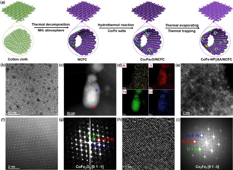 本研究创新性地提出一种热驱动金属原子迁移-捕获策略,在柔性N掺杂碳纤维布基底上锚定单原子Fe/Co-NX团簇与CoFe纳米颗粒,获得ORR/OER催化活性高,反应物/产物及电子输运快的多功能空气电极。这一策略使得电极表面同时具备了ORR与OER的双功能催化性能,大大提高了电化学反应的效率。最终的实验结果表明,该催化剂在锌空气电池应用中表现出卓越的性能,液态和固态电池的峰值功率密度分别达到237.4 mW cm-2和141.1 mW cm-2,经过2300次充放电循环后性能保持稳定。